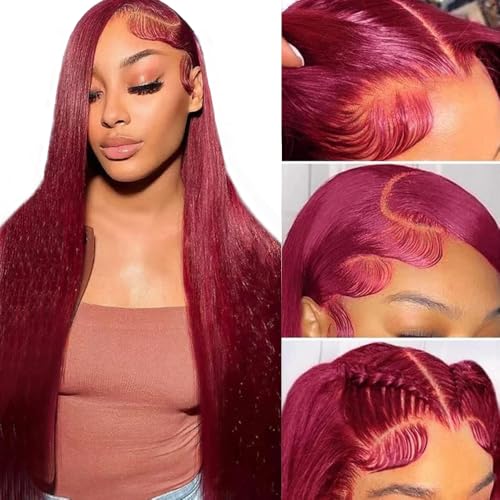 【99j Burgundy Straight 13×6 Lace Frontal Wigs Human Hair Quality】:Straight Lace Front Wigs Human Hair Pre Plucked, True To Length, No Shedding ,No Tangles , No Smell, Soft, Can be Straightened And Restyled, Can Be Side Part, Middle Part, Free Part.High Ponytail& Bun, Durable, Reusable, Styled As Your Own Hair.