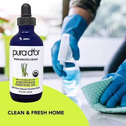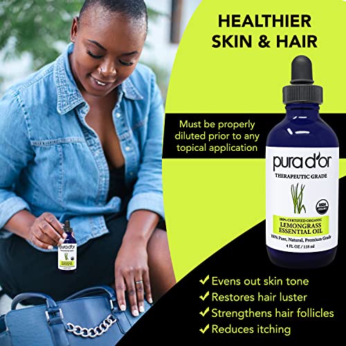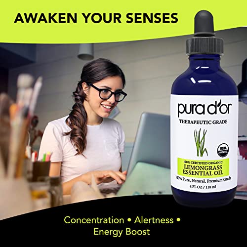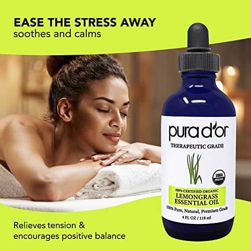 PURA D’OR Organic Lemongrass Essential Oil, 4oz, Therapeutic Grade, for Hair, Body, Skin, Aromatherapy, Relaxation, Massage, Vitality, Home, DIY Soap